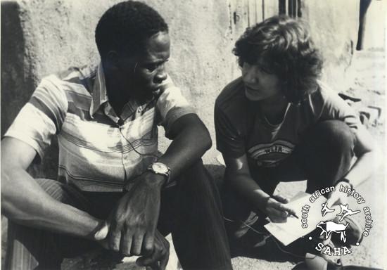 This is a digital copy of a black and white photograph of Julie Frederikse conducting an interview in a rural area of Zimbabwe, taken by Biddy Partridge in April 1980. This photograph was digitised by Specialised Archival Solutions in 2015 for inclusion in Julie Frederikse's 'Author's Reflection' for the new edition of "The Unbreakable Thread: non-racialism in South Africa". Also included in the SAHA online repository 'Tracing the unbreakable thread: non-racialism in South Africa today' |