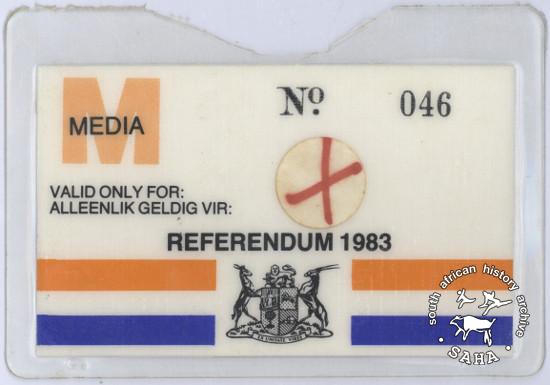 This is a digital copy of the press pass No. 046 issued to Julie Frederikse valid only for the 1983 referendum in South Africa. This item was digitised by Specialised Archival Solutions in 2015 for inclusion in Julie Frederikse's 'Author's Reflection' for the new edition of "The Unbreakable Thread: non-racialism in South Africa". Also included in the SAHA online repository 'Tracing the unbreakable thread: non-racialism in South Africa today' |
