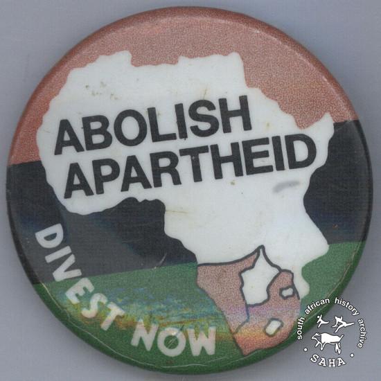 Badge: 'ABOLISH APARTHEID : DIVEST NOW' |