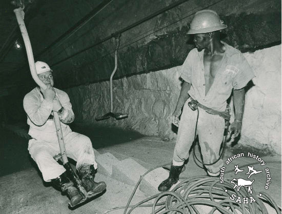 This black and white photograph of workers underground in a platinum mine was taken by Steve Hilton-Barber for Afrapix. Date unknown. This photograph was digitised by Africa Media Online (AMO) in 2009. |