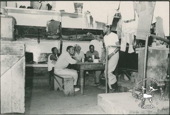 This black and white photograph depicts a scene from life in a men's hostel. Photographer and date unknown. This photograph was digitised by Africa Media Online (AMO) in 2009.