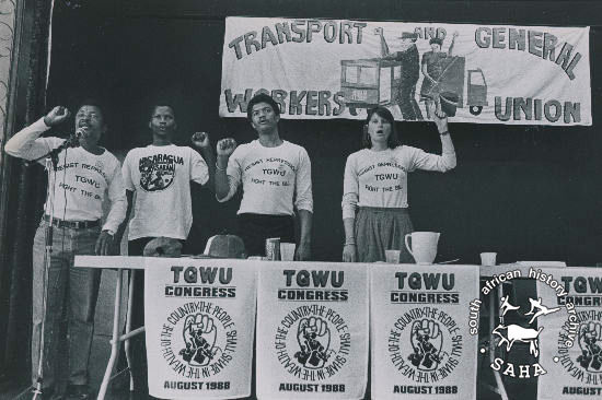 This black and white photograph of the annual general meeting of the Transport and General Wokers Union (TGWU) was taken by Rafs Mayet for Afrapix in August 1988. This photograph was digitised by Africa Media Online (AMO) in 2009. |