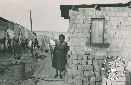 This black and white photograph of Dorothy standing on the foundation part of her house which she had to demolish to make way for the new sewerage in Alexandra township was taken by an unidentified photographer. This photograph was digitised by Africa Media Online (AMO) in 2009. |