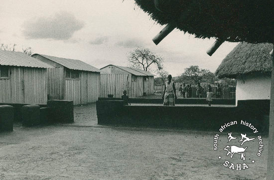 This black and white photograph of women and children outside their corrugated iron dwellings was taken by an unidentified photographer. This photograph was digitised by Africa Media Online (AMO) in 2009. |