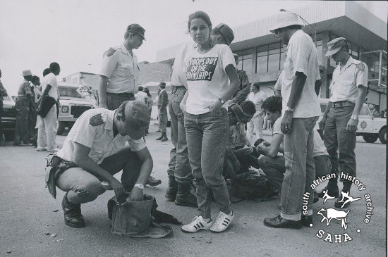 This black and white photograph of police checking bags for cameras in Alexandra was taken by Eric Miller. This photograph was digitised by Africa Media Online (AMO) in 2009. |