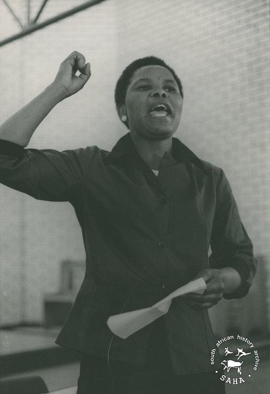 This is a black and white photograph of Amanda Kwadi at a protest meeting, date and photographer unknown. This photograph was digitised by Africa Media Online (AMO) in 2009. Included in SAHA exhibition kit and virtual exhibition, titled 'Women hold up half the sky: commemorating women in the struggle'. |
