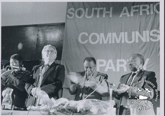 SACP Commemorative meeting in London. L. to R.: Joe Slovo, Dan Thloume, Alfred Nzo. 1985. |