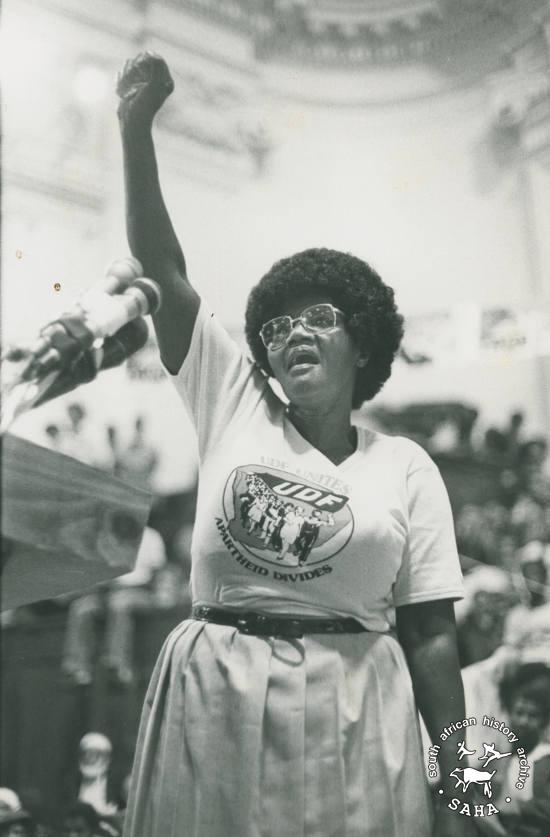 This black and white photograph of Dorothy Nyembe at a protest meeting was taken by Myron Peters, date unknown. This photograph was digitised by Africa Media Online (AMO) in 2009. Included in SAHA exhibition kit and virtual exhibition, titled 'Women hold up half the sky: commemorating women in the struggle'. |