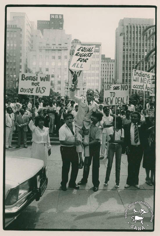 Protesters holding a poster with caption 'Equal rights for all' during a United Democratic Front (UDF) demonstration in the Durban City Hall, November 1983. |