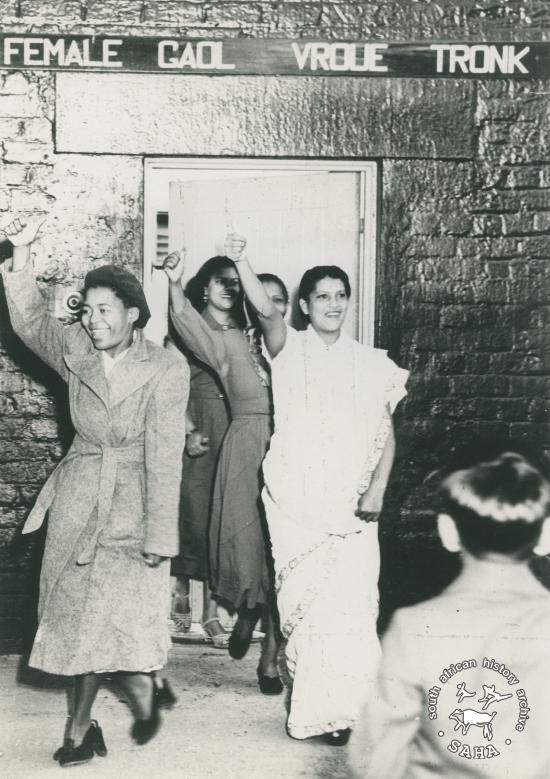 This is a black and white photograph of triumphant women leaving the female prison after being jailed for resisting unjust laws in 1952. This photograph was digitised by Africa Media Online (AMO) in 2009. Included in the SAHA exhibition kit and virtual exhibition, titled 'Women hold up half the sky: commemorating women in the struggle'. |