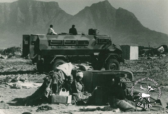 Police oversee destruction of a squatter camp near C.T. 1983.(See note). |