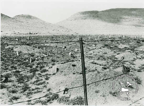 This black and white photograph of graves in the barren veld was taken by an unidentified photographer for the International defence and Aid fund (IDAF). Date unknown. This photograph was digitised by Africa Media Online (AMO) in 2009. |