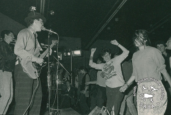 This black and white photograph of people dancing to the music at an End Conscription Campaign (ECC) music festival was taken by Paul Weinberg for Afrapix. This photograph was digitised by Africa Media Online (AMO) in 2009. |