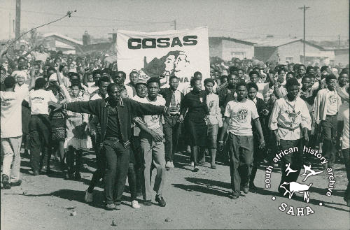 This black and white photograph of students during a march of the Congress of South African Students (COSAS) was taken by an unidentified photographer in the 1980s. This photograph was digitised by Africa Media Online in 2009. |