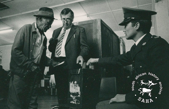 This black and white photograph of a voter casting his ballot at the 'Coloured' election in Johannesburg in 1984 was taken by Wendy Schwegmann. This photograph was digitised by Africa Media Online (AMO) in 2009. |