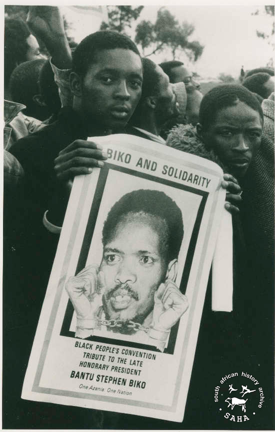 This black and photograph of a mourner carrying a poster with the caption 'Biko and Solidarity' at Steve Biko's funeral in September 1977 was taken by an unidentified photographer for the International Defence and Aid Fund (IDAF). This photograph was digitised by Africa Media Online (AMO) in 2009.