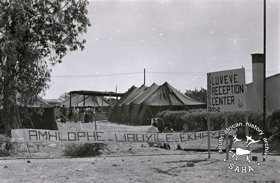 Derived from a black and white 35mm negative, this image of the Luveve Reception Centre in Bulawayo for refugee returnees was taken by Zenzo Nkobi in 1980. This negative was digitised by Africa Media Online in 2009.