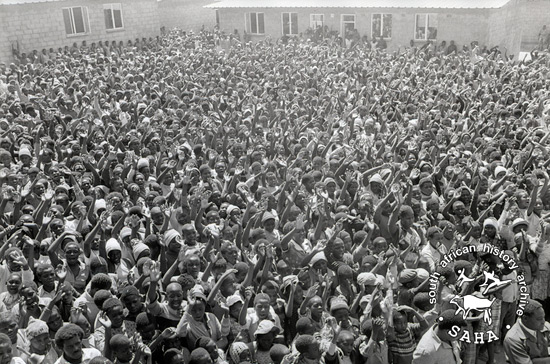 Derived from a black and white 35mm negative, this image of people attending a parade in Victory Camp, was taken by Zenzo Nkobi in 1978. This negative was digitised by Africa Media Online in 2009.