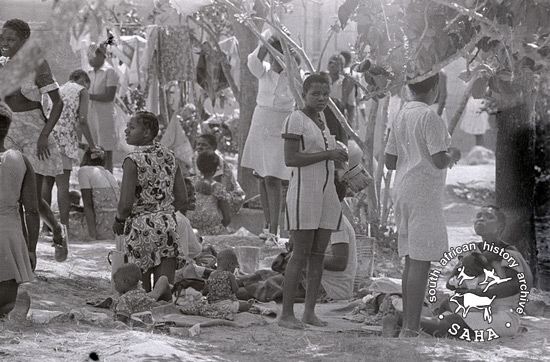 Derived from a black and white 35mm negative, this image of ladies with babies during laundry time at Victory Camp, was taken by Zenzo Nkobi in 1978. This negative was digitised by Africa Media Online in 2009.