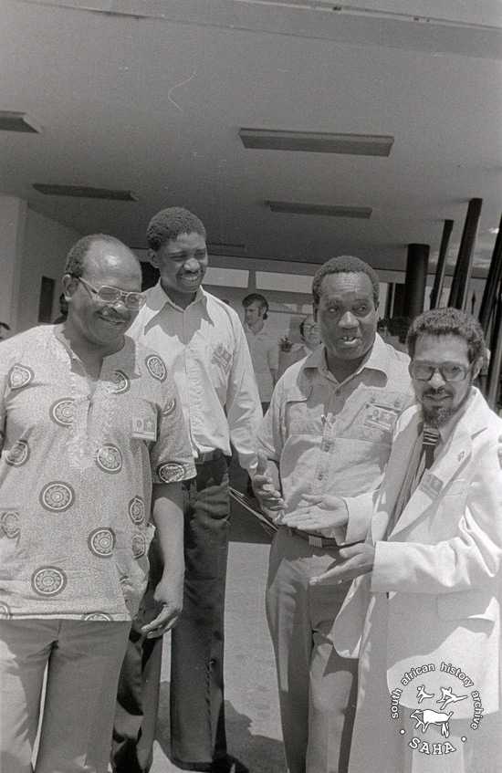 Derived from a black and white 35mm negative, this image of Delegates and ZAPU representatives was taken by Zenzo Nkobo in 1978. This negative was digitised by Africa Media Online in 2009. |