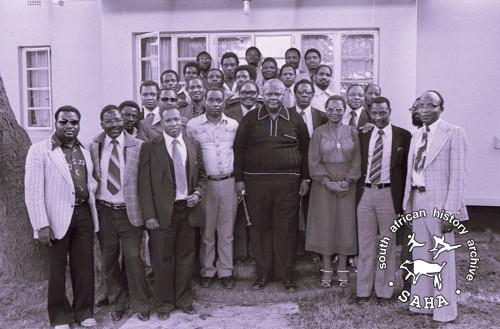 Derived from a black and white 35mm negative, this image of ZAPU representatives and general staff in Zambia was taken by Zenzo Nkobi in 1977. Individuals identified in this image are Eunice Sandi and George Silundika. This negative was digitised by Specialized Archival Solutions in 2010.