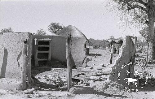 Derived from a black and white 35mm negative, this image of a house destroyed by the 5th Brigade in Matopos was taken by Zenzo Nkobi in 1980. This negative was digitised by Specialized Archival Solutions in 2010.