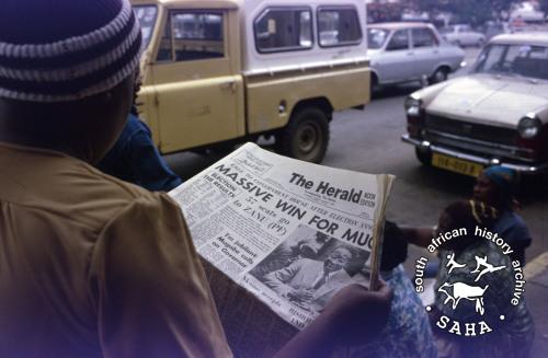 Derived from a black and white 35mm negative, this image of a voter reading 'The Herald' to ascertain election results was taken by Zenzo Nkobi in 1980. This negative was digitised by Specialized Archival Solutions in 2010.