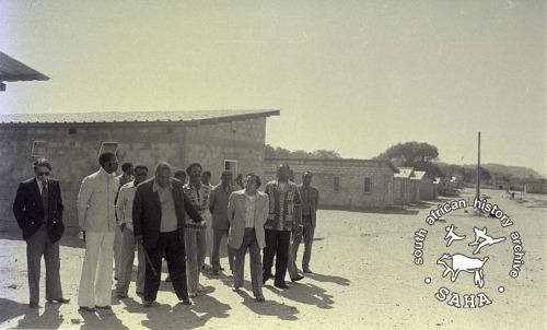 Derived from a black and white 35mm negative, this image of Joshua Nkomo, Sridath Ramphal (Commonwealth Secretary-General), O. Matshalaqa and delegates during a visit to Victory Camp in 1978 was taken by Zenzo Nkobi. This negative was digitised by Specialized Archival Solutions in 2010.