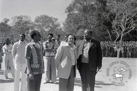Commonwealth leaders delivering donations to refugees at Victory Camp in 1978, individuals identified Rampaul, Joshua Nkomo, John Nkomo and O. Matshalaqa |