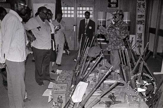 Derived from a colour 35mm negative, this image of ZAPU officials with displayed weapons was taken by Zenzo Nkobi in 1979. This negative was digitised by Africa Media Online (AMO) in 2009.