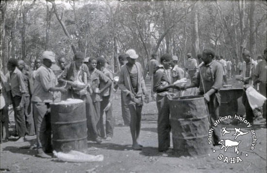 Derived from a black and white 35mm negative, this image of food being distributed on open day in Nampundwe Camp was taken by Zenzo Nkobi in 1978. This negative was digitised by Africa Media Online in 2009.