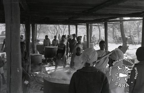 Derived from a black and white 35mm negative, this image of food being prepared in Victory Camp was taken by Zenzo Nkobi in 1978. This negative was digitised by Specialized Archival Solutions in 2010.