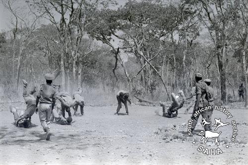 Derived from a black and white 35mm negative, this image of ZPRA cadres in training at Freedom Camp was taken by Zenzo Nkobi in 1977. This negative was digitised by Africa Media Online in 2009.
