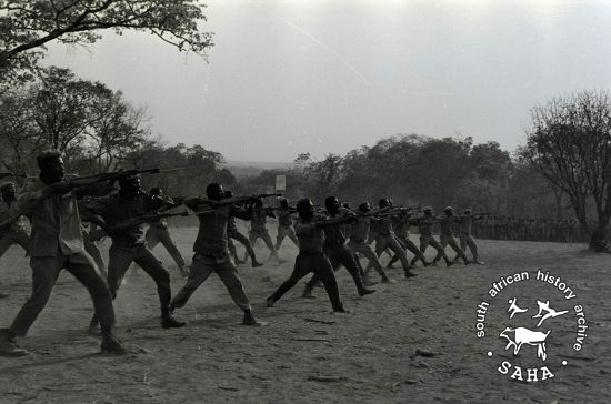 Derived from a colour 35mm negative, this image of ZPRA cadres training in Freedom Camp in 1977 was taken by Zenzo Nkobi. This negative was digitised by Africa Media Online (AMO) in 2009.