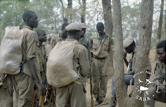Derived from a colour 35mm negative, this image of ZPRA troops in training was taken by Zenzo Nkobi in 1977. This negative was digitised by Africa Media Online in 2009.