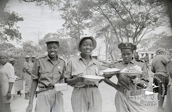 Derived from a black and white 35mm negative, this image of cadres of the Women's Brigade having a meal in Victory Camp in Zambia was taken by Zenzo Nkobi in 1977. Identified in this image are Tendani Choeni, Gladys Moyo, Sikaugezile Mazwi, Nompumelelo Moyo and Maukazizwe. This negative was digitised by Africa Media Online (AMO) in 2009.