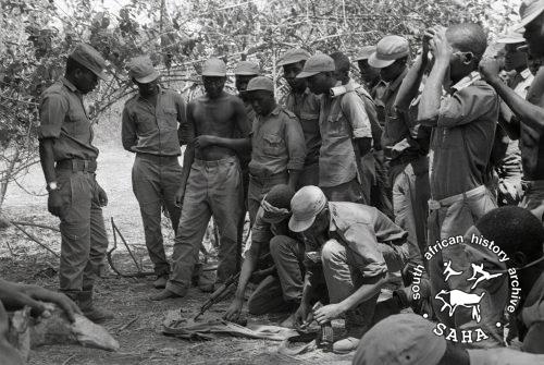 Derived from a black and white 35mm negative, this image of caders during a gun stripping lesson while training at the Camp for Guerrilla Training (CGT) was taken by Zenzo Nkobi in 1977. This negative was digitised by Specialized Archival Solutions in 2010.