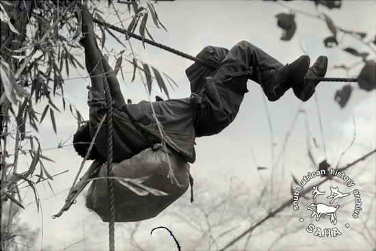 Derived from a black and white 35mm negative, this image of a ZPRA cadre crossing a river in flood using a rope was taken by Zenzo Nkobi in 1977. This negative was digitised by Africa Media Online (AMO) in 2009. A similar photograph appears in the publication 'Zimbabwe in the struggle: a contemporary documentation', published by the Zimbabwe African Peoples Union-Patriotic Front, circa 1978.