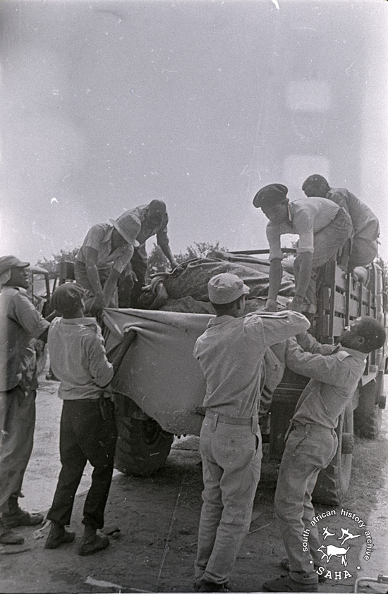 Bodies of victims of bombings in Freedom Camp , Zambia on 19 October 1978 being loaded onto a gaz truck for mass burial. |