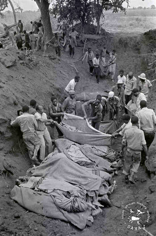 Bodies of bombing victims being moved into a mass grave after the Freedom Camp massacre |