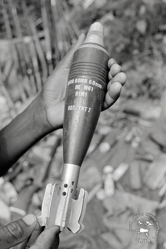 Derived from a black and white 35mm negative, this image of a rocket amongst weapons captured in Lusaka was taken by Zenzo Nkobi in 1979. This negative was digitised by Africa Media Online (AMO) in 2009.