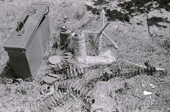 Derived from a black and white 35mm negative, this image of captured explosives, weapons and ammunition was taken by Zenzo Nkobi in 1979. This negative was digitised by Africa Media Online (AMO) in 2009.