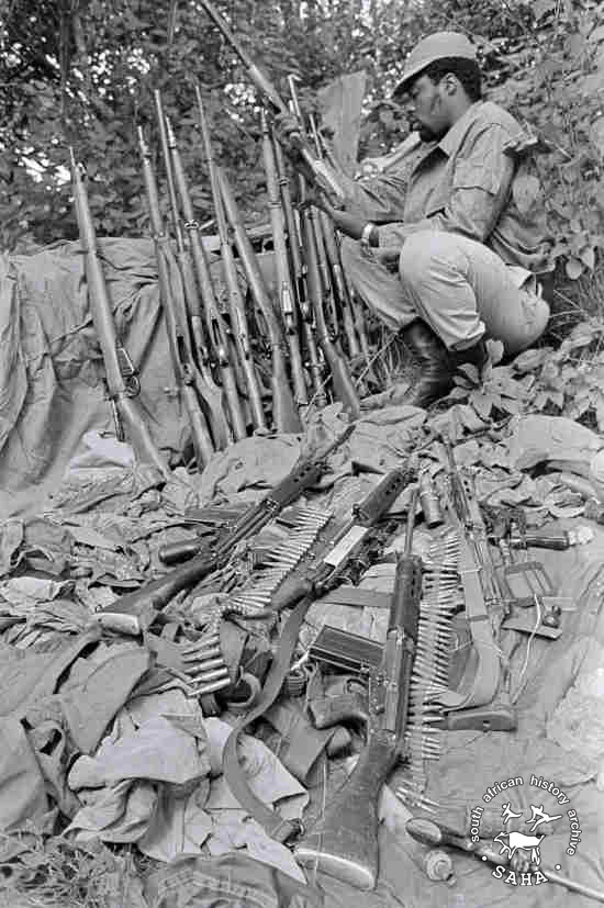 Derived from a colour 35mm negative, this image of Captured weapons, guns, ammunition, clothes and rockets taken by Zenzo Nkobi in 1979. This negative was digitised by Africa Media Online (AMO) in 2009.