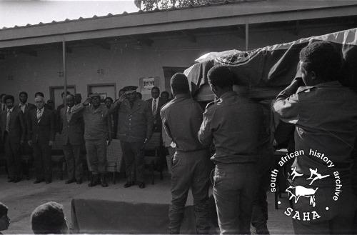 ► 3B_32_13 :: Nikita Mangena's coffin at Zimbabwe house in Lusaka, individuals identified Joshua Nkomo and Samuel Munodawafa