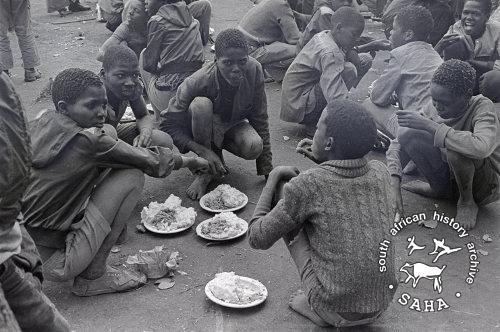 Derived from a black and white 35mm negative, this image of Children from Victory Camp and JZ Moyo Camp having a meal was taken by Zenzo Nkobi, circa 1978-9. This negative was digitised by Specialized Archival Solutions in 2010.