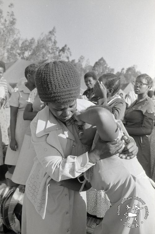 Derived from a black and white 35mm negative, this image of an emotional woman meeting her daughter who has returned from Zambia was taken by Zenzo Nkobi in 1980. This negative was digitised by Specialized Archival Solutions in 2010. The two women in this image have been identified by Sibonginkosi Hlabangana as relatives Sadie Moyo holding her daughter Nomhle Veli Moyo on the day Nomhle came back from Zambia. By 2013 both women were still living in Zimbabwe.