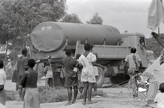 Derived from a black and white 35mm negative, this image of clean water being delivered to refugees in Victory Camp by truck was taken by Zenzo Nkobi in 1979. This negative was digitised by Africa Media Online (AMO) in 2009.