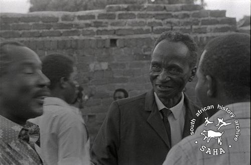 4A_66_04 :: Abraham Nkiwane with ZAPU officials outside Kwabata Hall after a meeting, individuals identified Abraham Nkiwane and Desire Khuphe