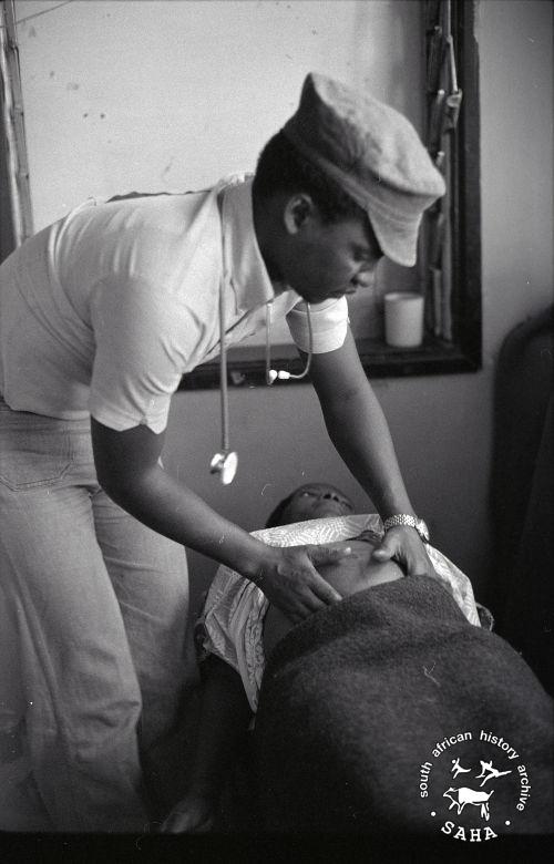 Derived from a black and white 35mm negative, this image of a pregnant woman being attended to by Dr Bango at Victory Camp's health centre was taken by Zenzo Nkobi, date unknown. This negative was digitised by Specialized Archival Solutions in 2010.