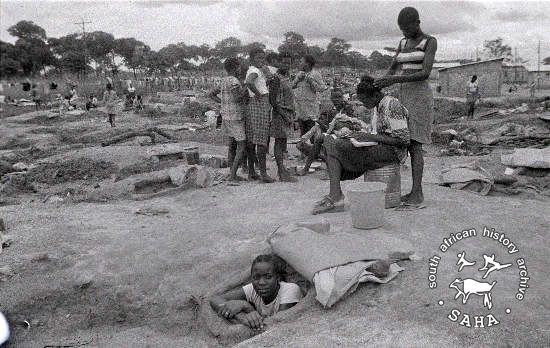 Derived from a black and white 35mm negative, this image of girls relaxing in Victory Camp with one girl looking out from a defence hole was taken by Zenzo Nkobi in 1979. This negative was digitised by Africa Media Online (AMO) in 2009.